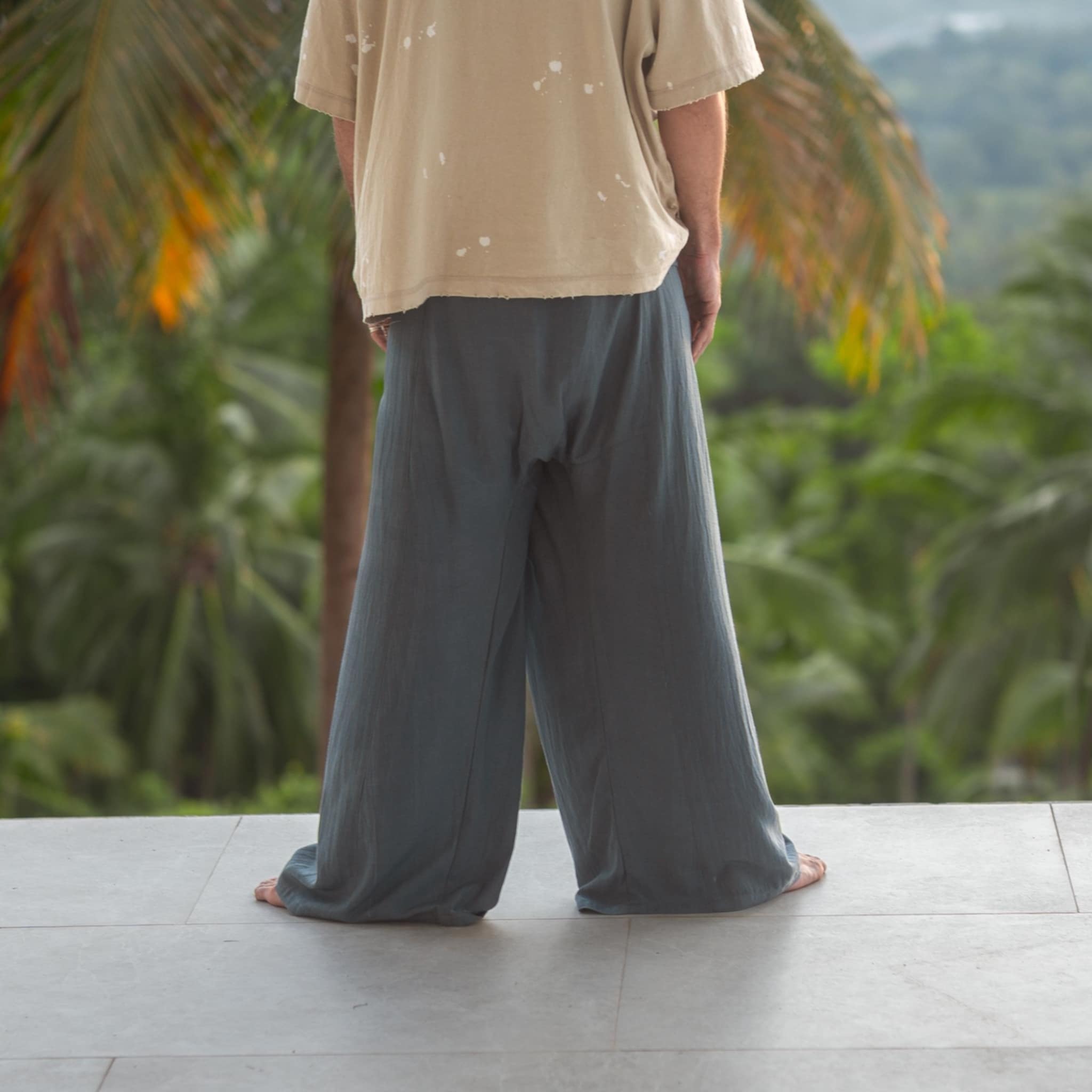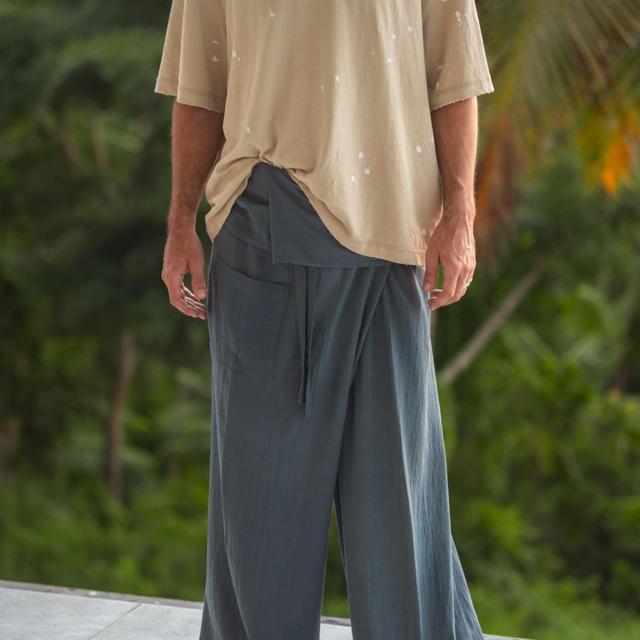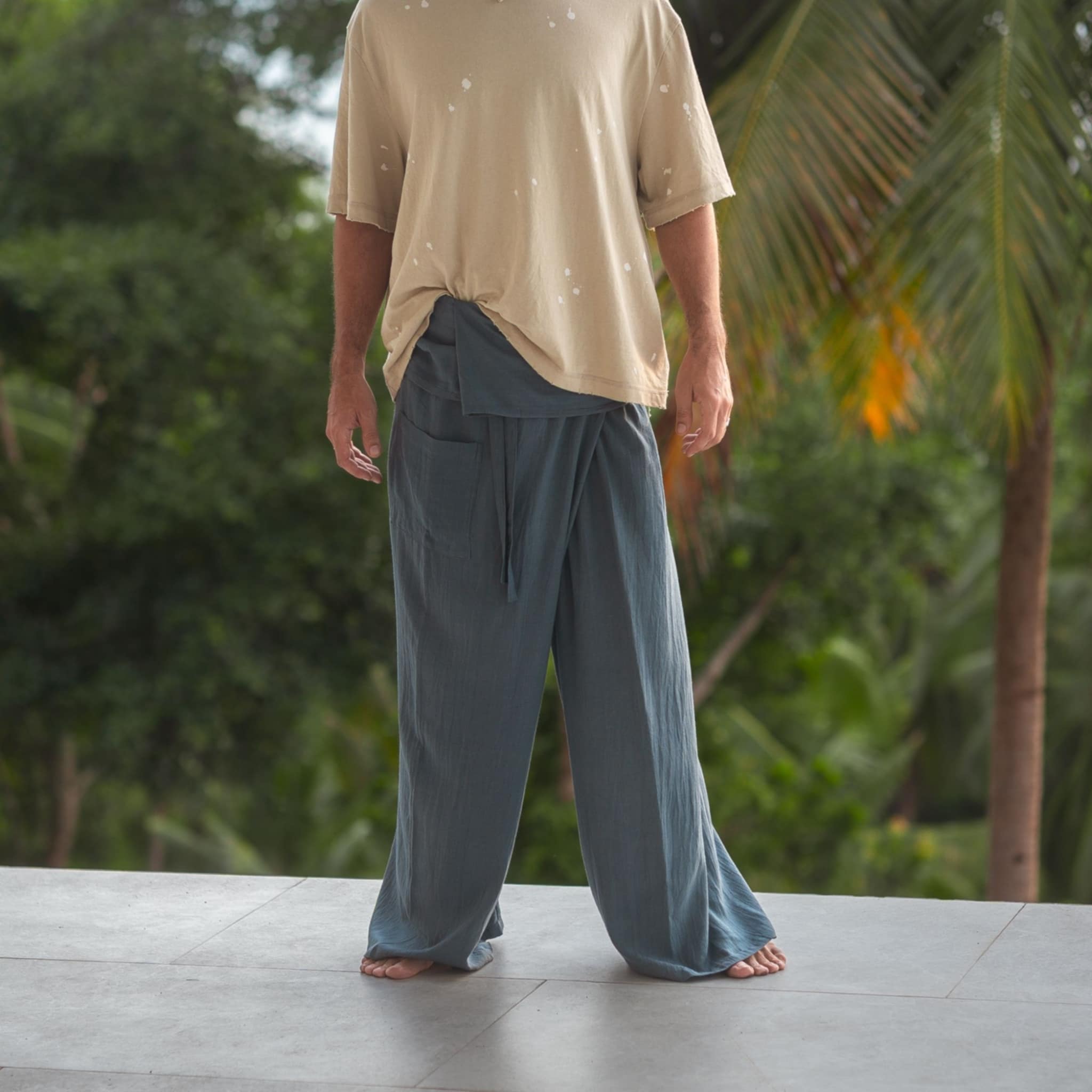Grey Thai fisherman pants in a hemp and cotton blend, tall prototype fit for men 6'2"+, adjustable wrap waist, ideal for yoga, meditation, travel, and relaxed boho summer style.