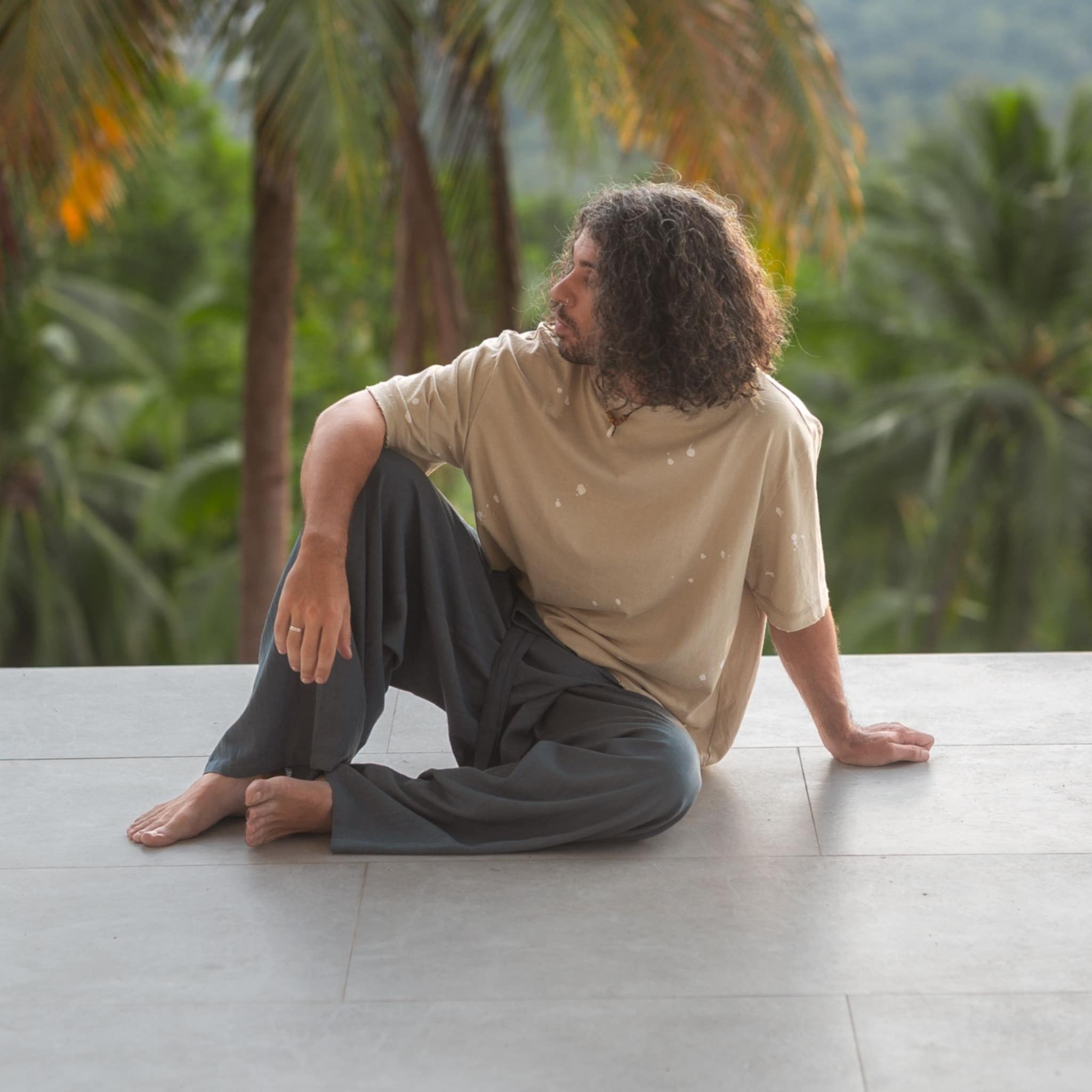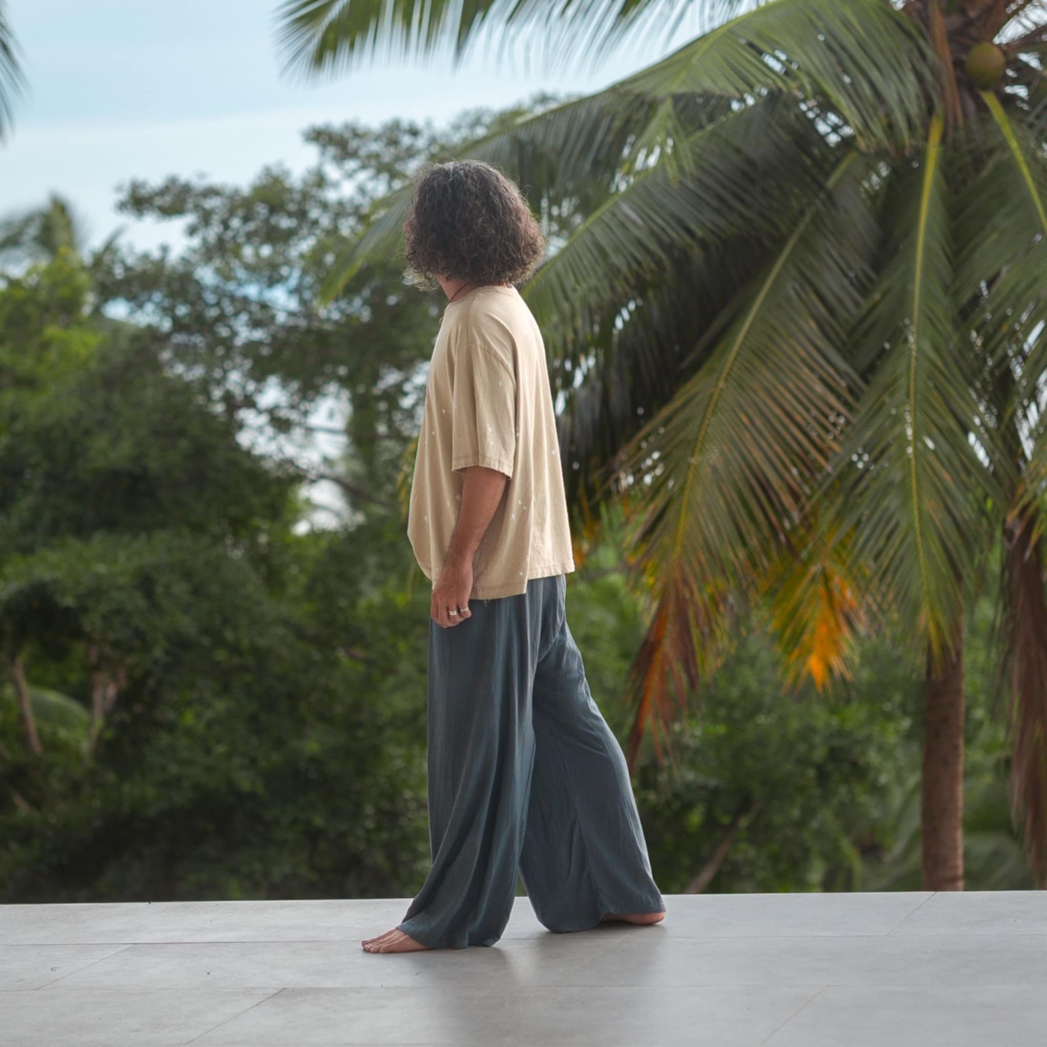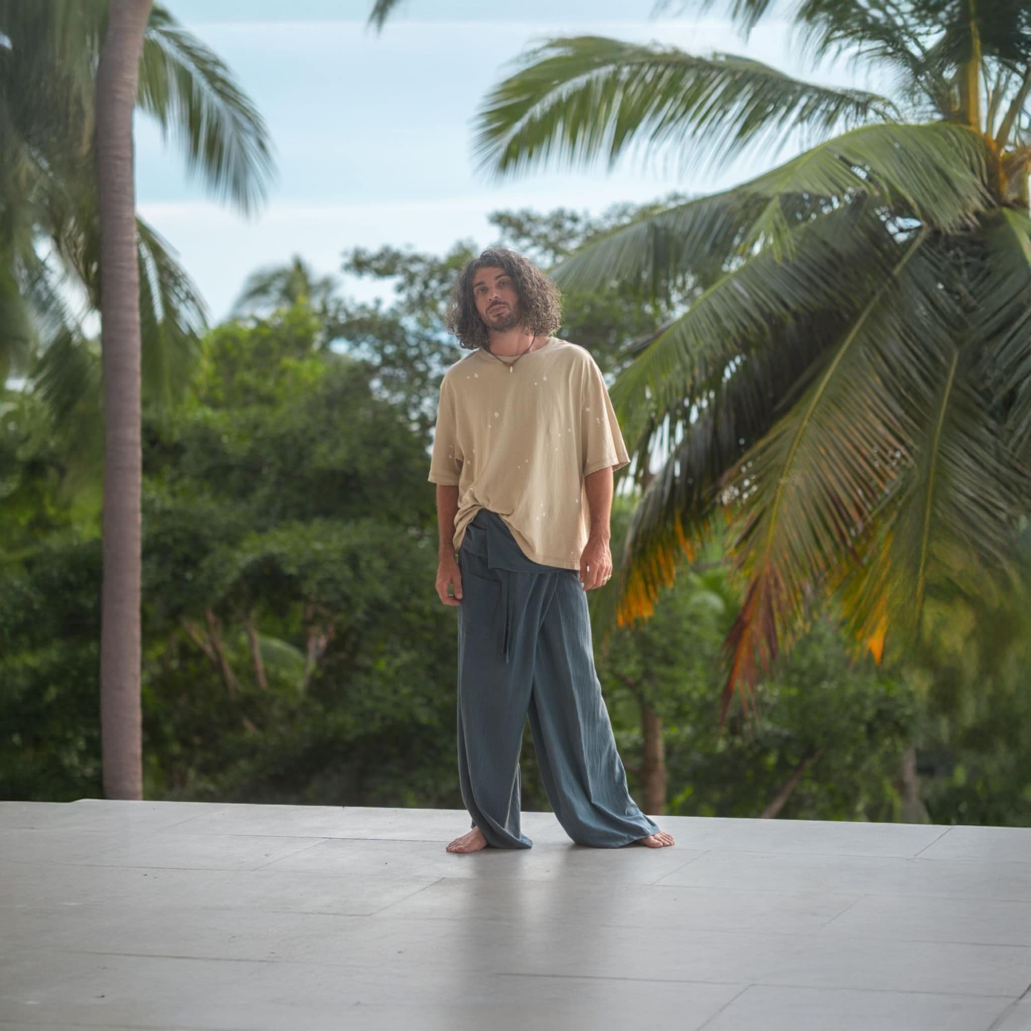 Grey Thai fisherman pants in a hemp and cotton blend, tall prototype fit for men 6'2"+, adjustable wrap waist, ideal for yoga, meditation, travel, and relaxed boho summer style.