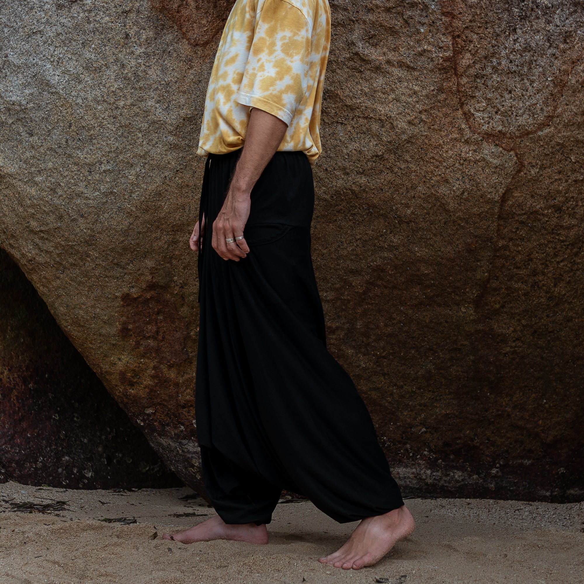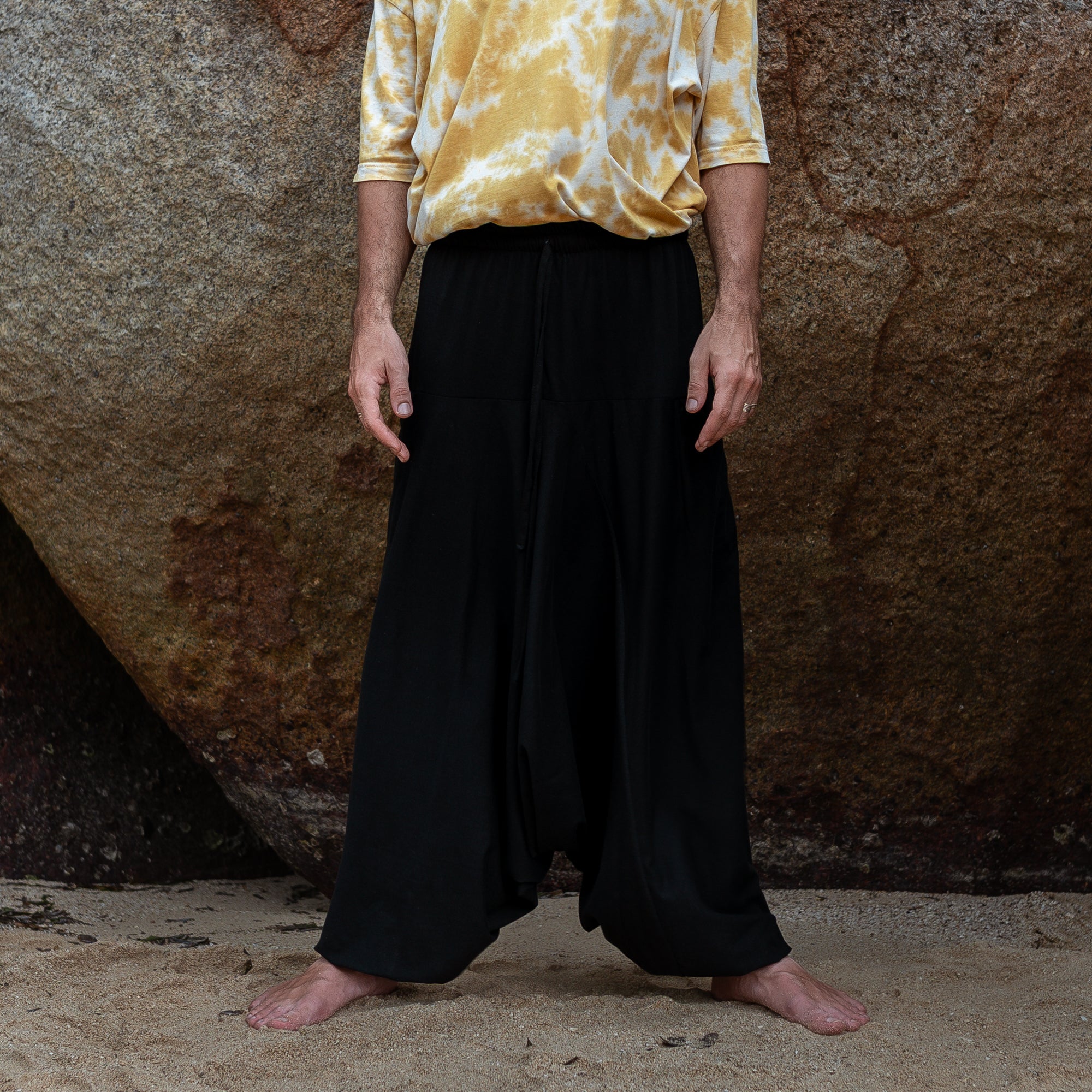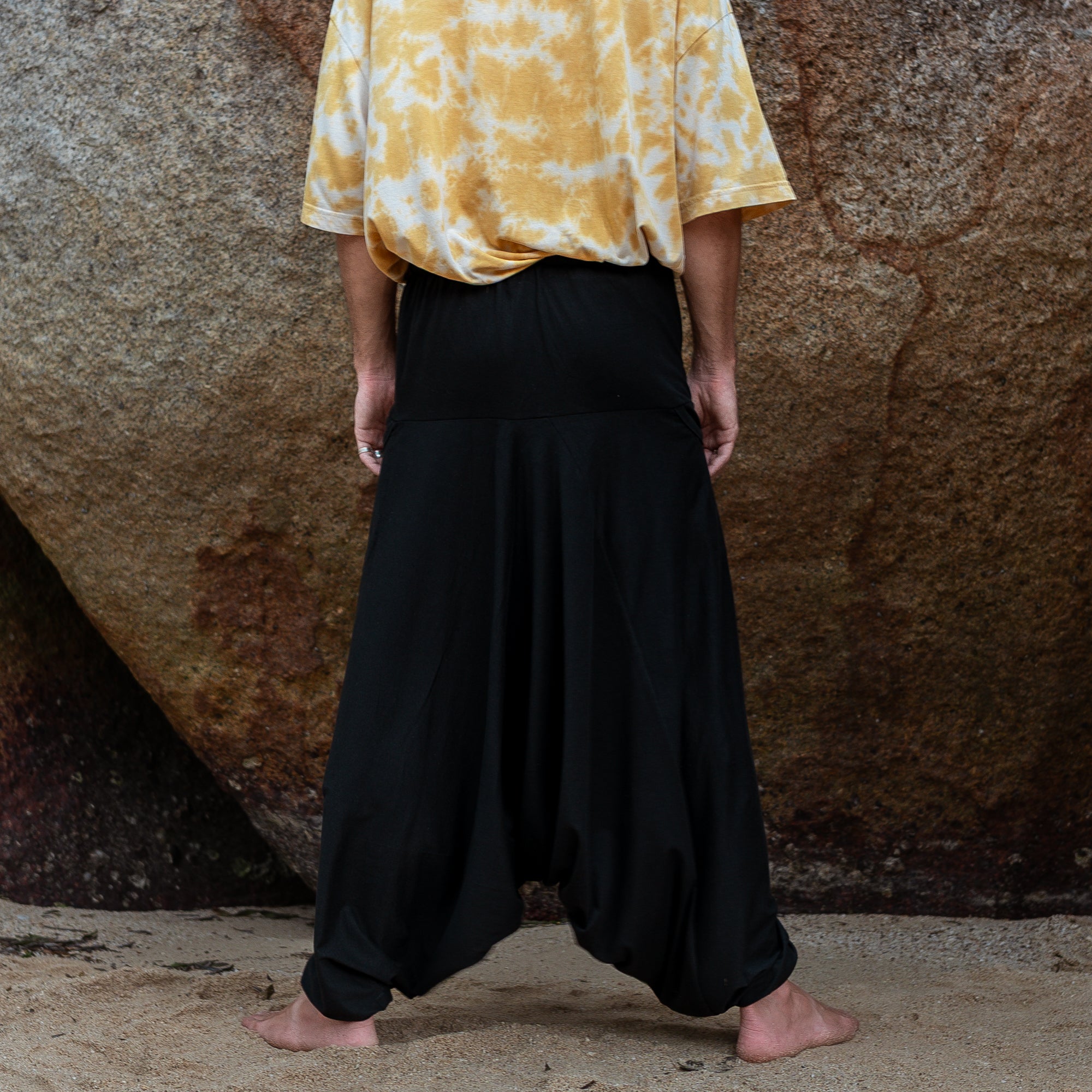These men’s harem pants are crafted from 100% breathable cotton in solid black. Designed with a relaxed, baggy fit and drop-crotch style, they offer freedom of movement, a casual boho vibe, and are best suited for taller slim/medium builds. This is a limited prototype release — our regular fit version will follow soon.