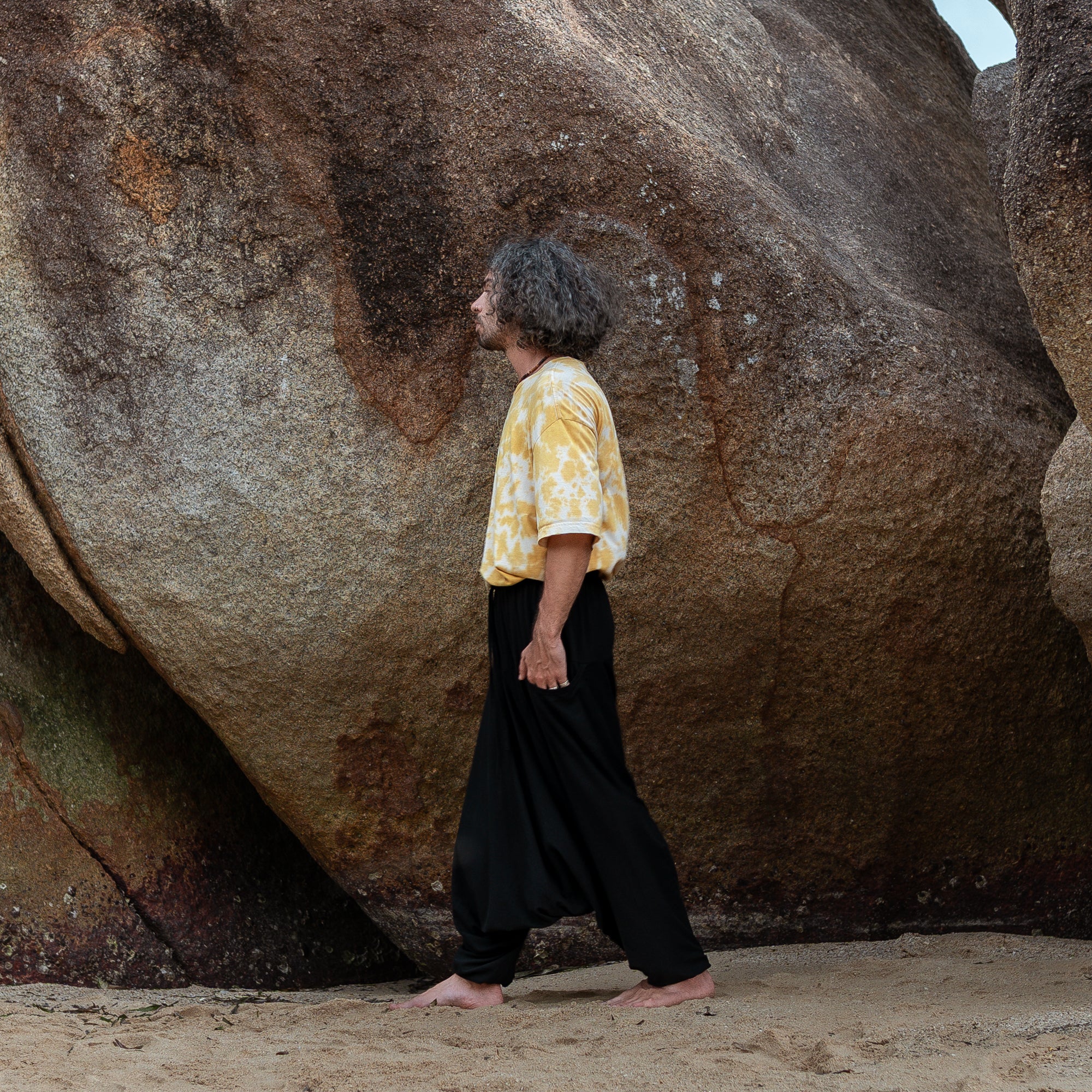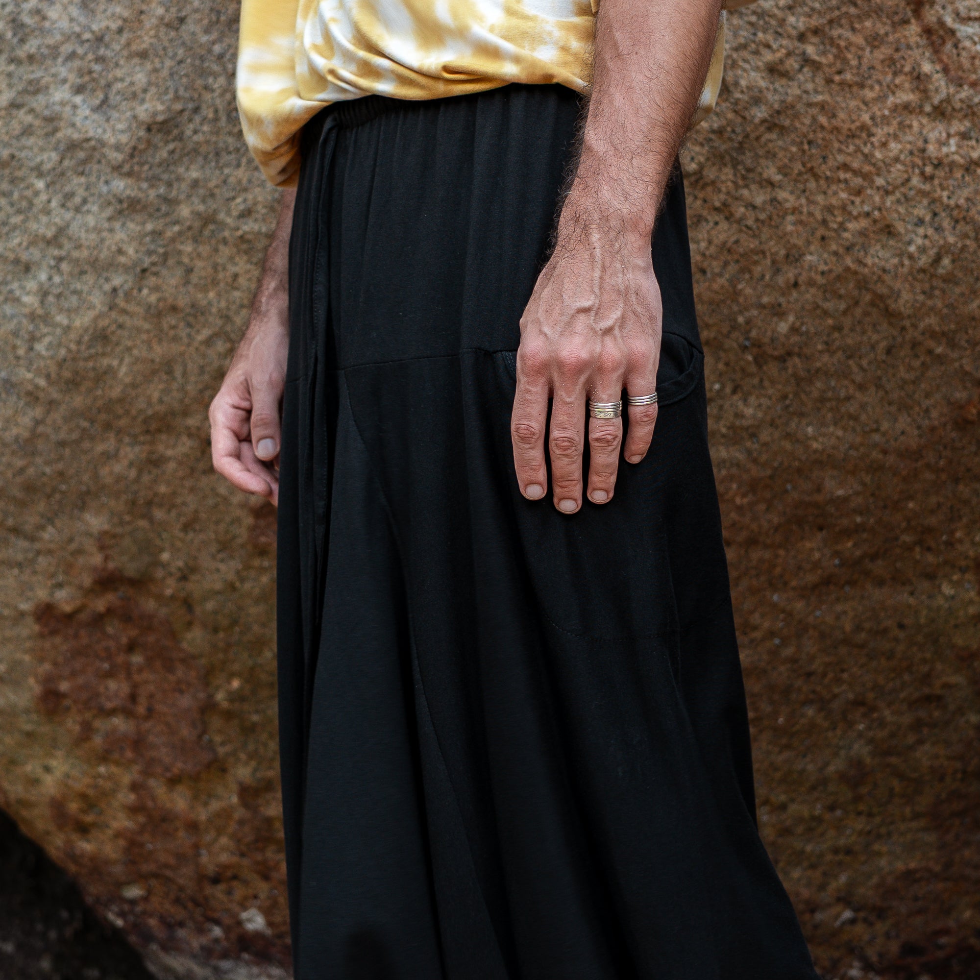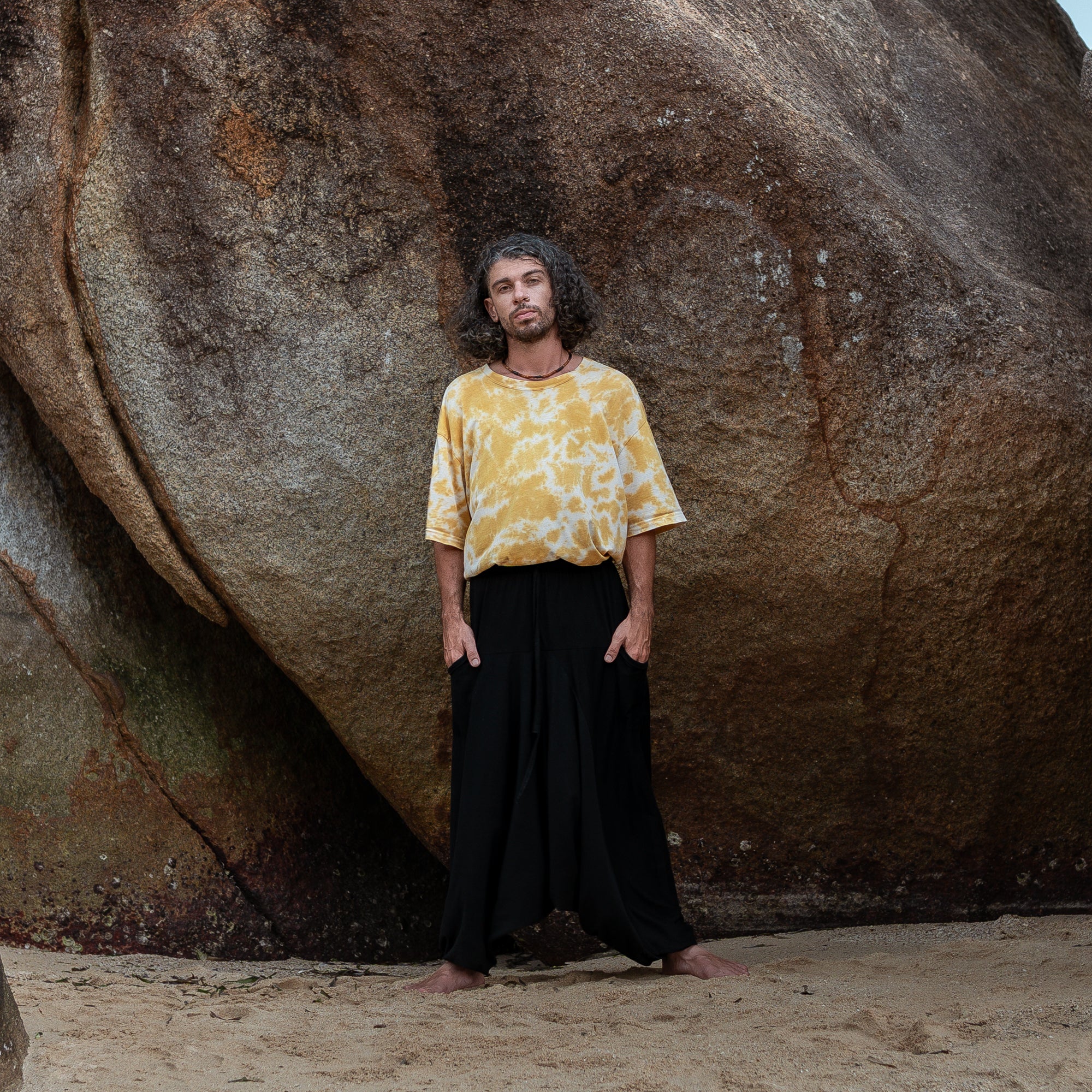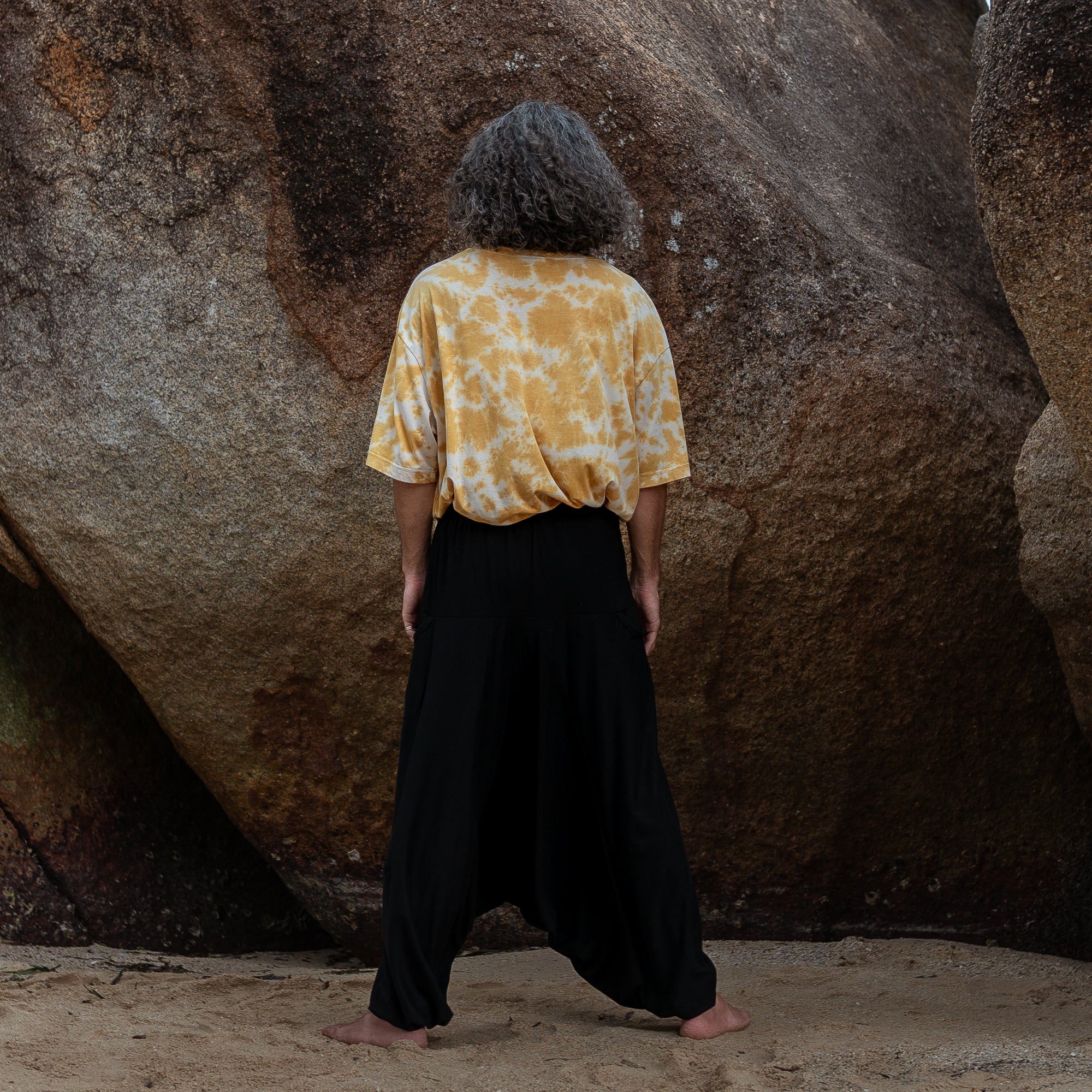 These men’s harem pants are crafted from 100% breathable cotton in solid black. Designed with a relaxed, baggy fit and drop-crotch style, they offer freedom of movement, a casual boho vibe, and are best suited for taller slim/medium builds. This is a limited prototype release — our regular fit version will follow soon.