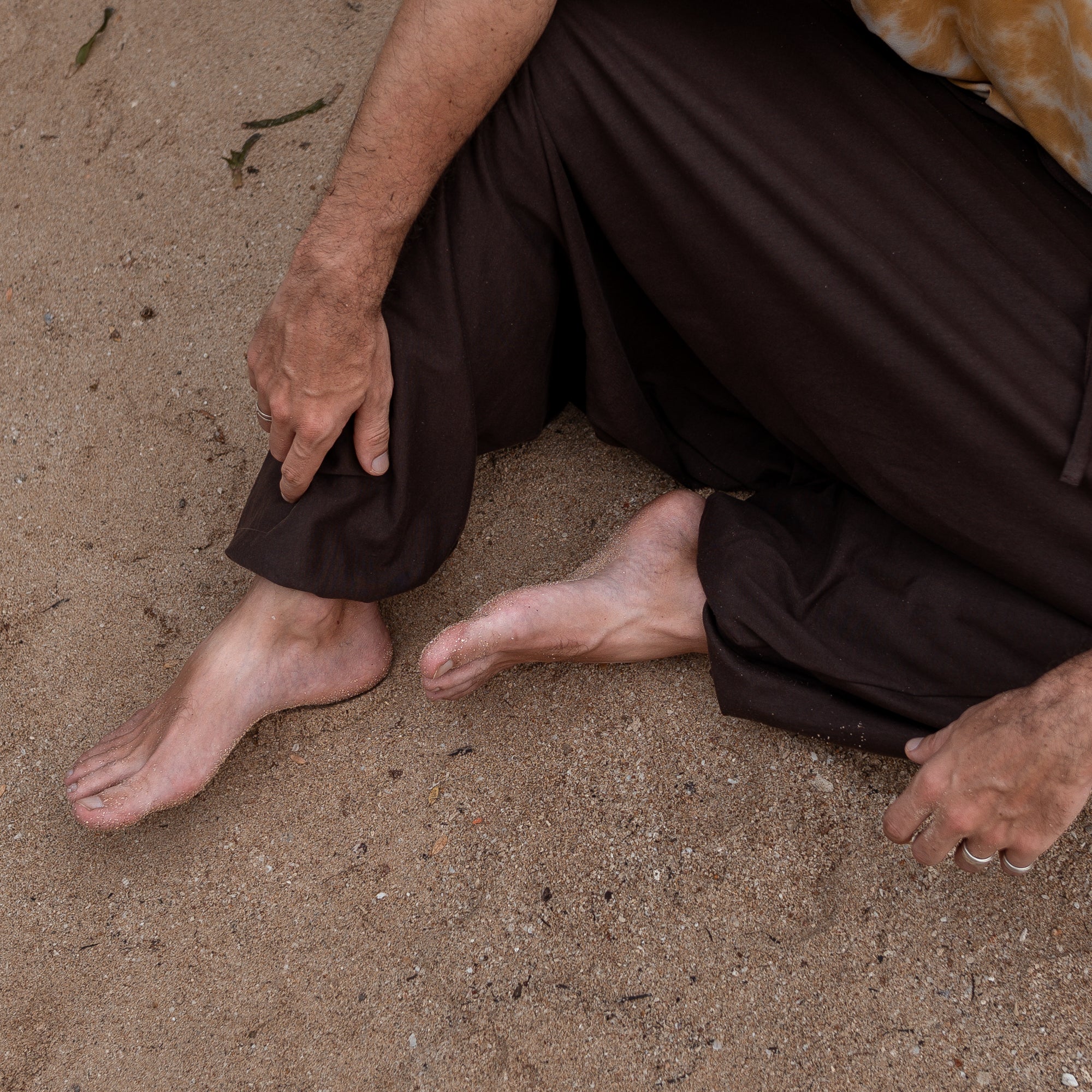 Crafted from 100% breathable cotton, these men’s harem pants come in a warm, solid brown. The relaxed, baggy cut and drop-crotch design give you freedom of movement and an easy boho look. This prototype run was made a little longer than standard, making them ideal for tall men with a slim to medium build.